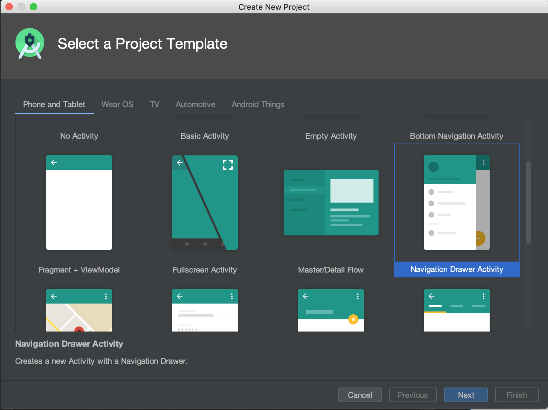 새로운 Project를 생성 시 아래 그림 처럼 Navigation Drawer Activity를 선택하시면 안됩니다!