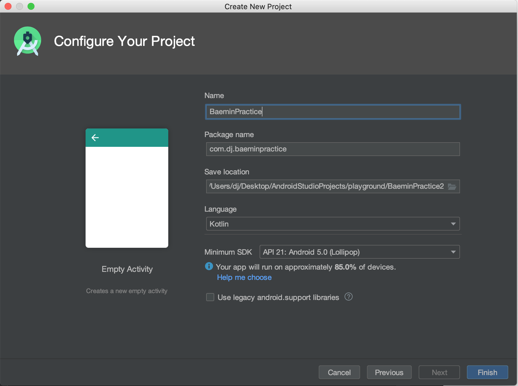 왜냐하면 위에 말했듯이, Navigation Drawer Activity는 1개의 Activity만 존재하고 Fragment들을 이용하여 화면을 전환시키는 방식인 반면에 배달의 민족 App은 모두 Activity로 실행되기 때문에 단순히 Empty Activity로 프로젝트를 생성하여 Customizing 하면 되기 때문입니다.