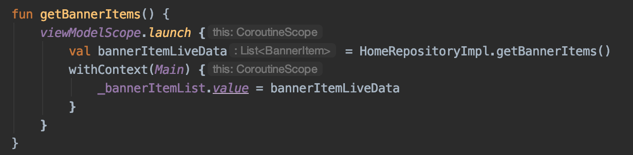 위 HomeViewModel에서는 HomeRepositoryImpl.getBannerItems()로 fakeBannerItemList를 받아오고 있습니다. 물론 suspend fun이기 때문에 coroutineScope 안에서 실행되어야 하며 viewModel 내부이기 때문에 viewModelScope을 사용합니다.