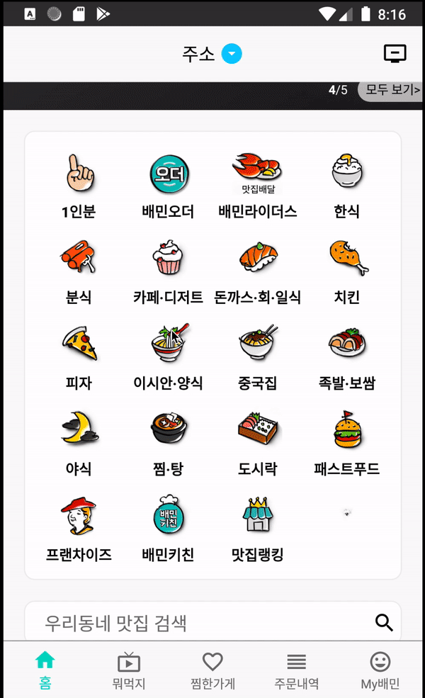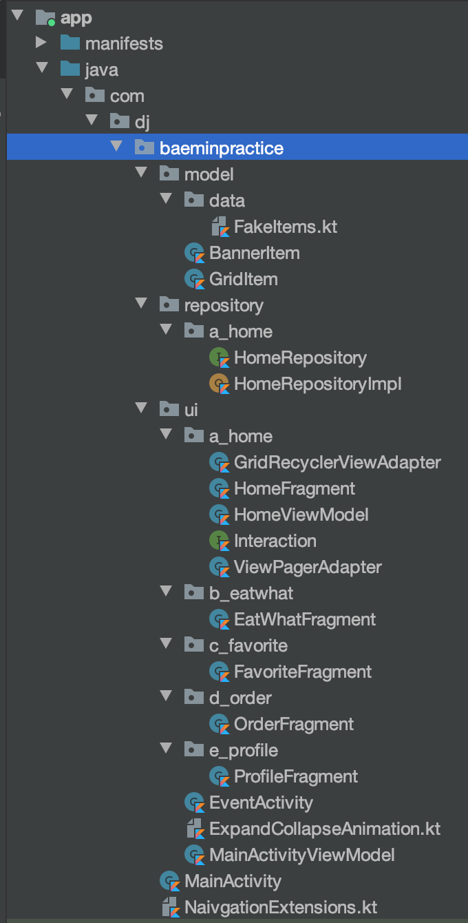 아직 a_home 즉 홈 화면 말고 다른 뭐 먹지부터 My배민 화면까지 구현한 것이 없어서 a_home을 제외한 다른 패키지 내부가 비어 보이지만 추후에 만들어나가며 채워나갈 것이니 걱정하지 않으셔도 됩니다.