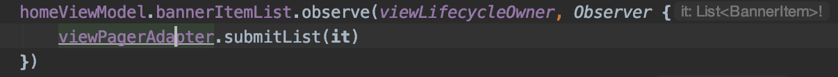 HomeViewModel에서 값을 할당하면 bannerItemList liveData를 관찰하고 있는 HomeFragment.kt에서는 해당 리스트 값을 viewPagerAdapter로 넘겨주어 자동으로 스크롤되는 배너가 완성되는 것입니다.