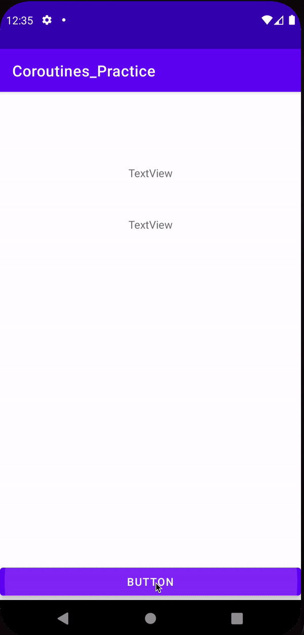 그럼 "Started"가 TextView에 출력되고 Button이 disabled 되며, runTime() suspend 함수의 실행이 끝나고 나면 "Ended" 문구가 출력되고, Button이 enabled 되어야 합니다.