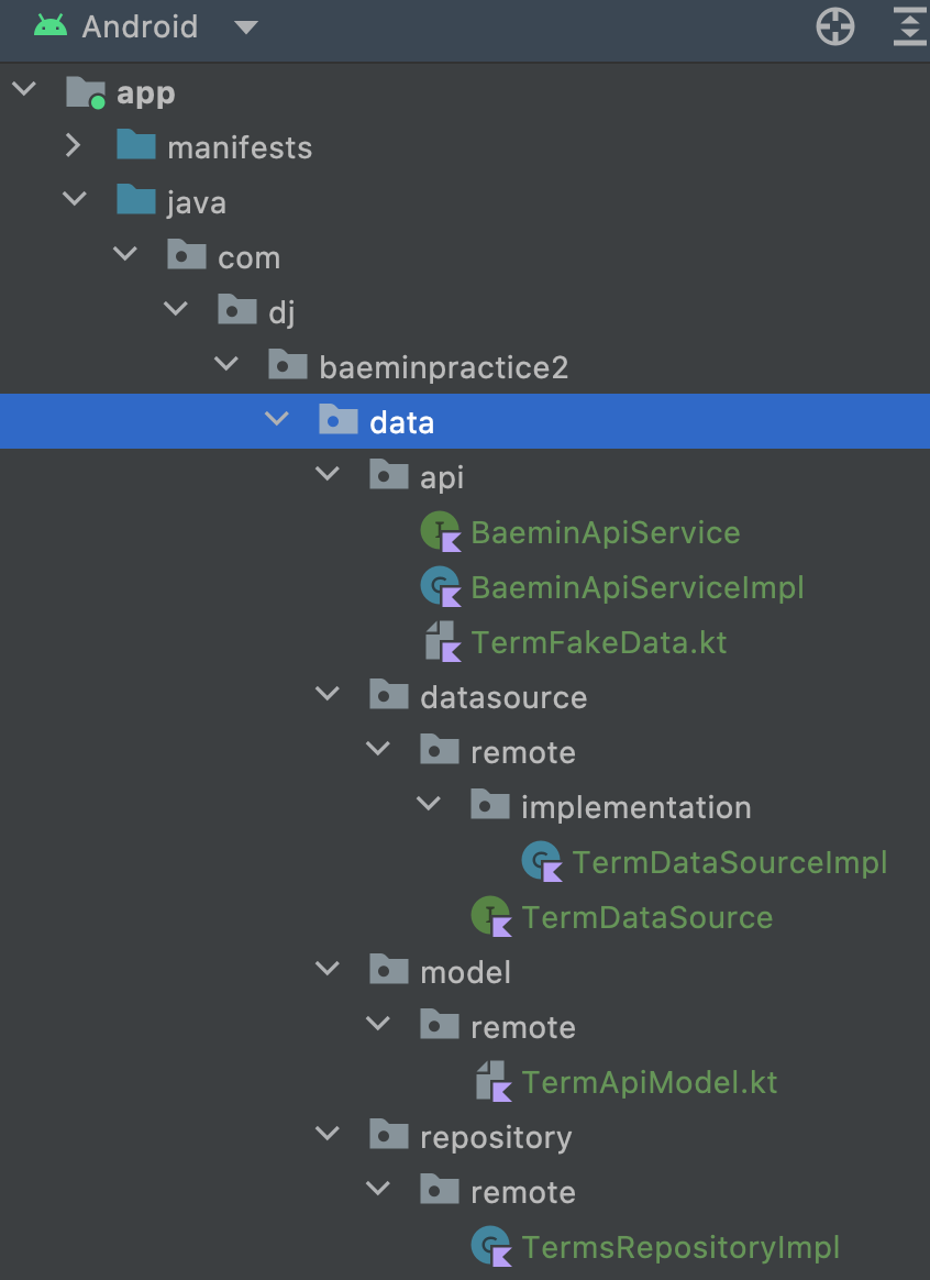 - BaeminApiService는 TermFakeData.kt에 있는 가짜 데이터를 리턴해주는 역할을 하는 인터페이스 입니다.