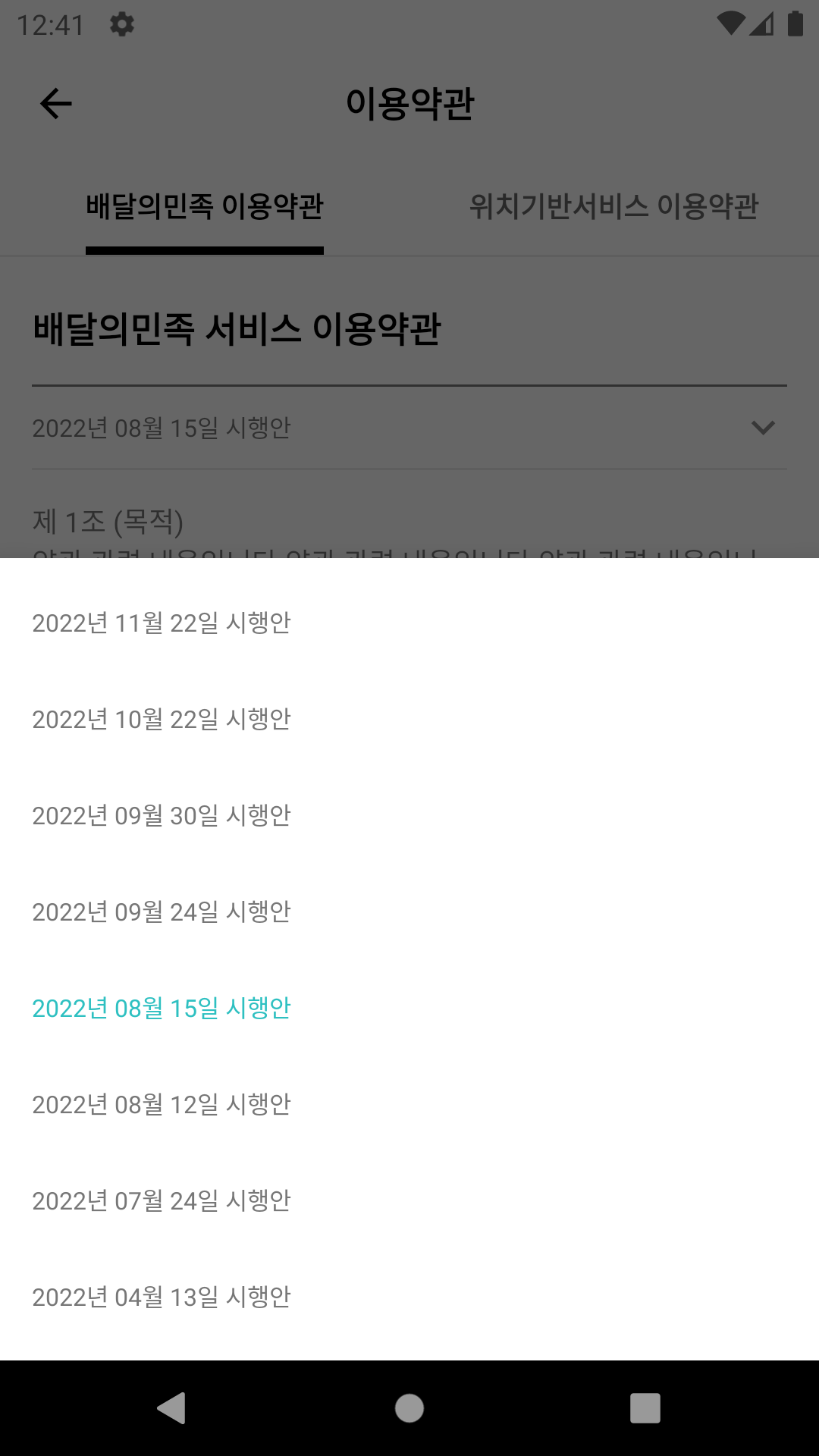 2. 과거 약관을 선택할 수 있는 하단 팝업 화면